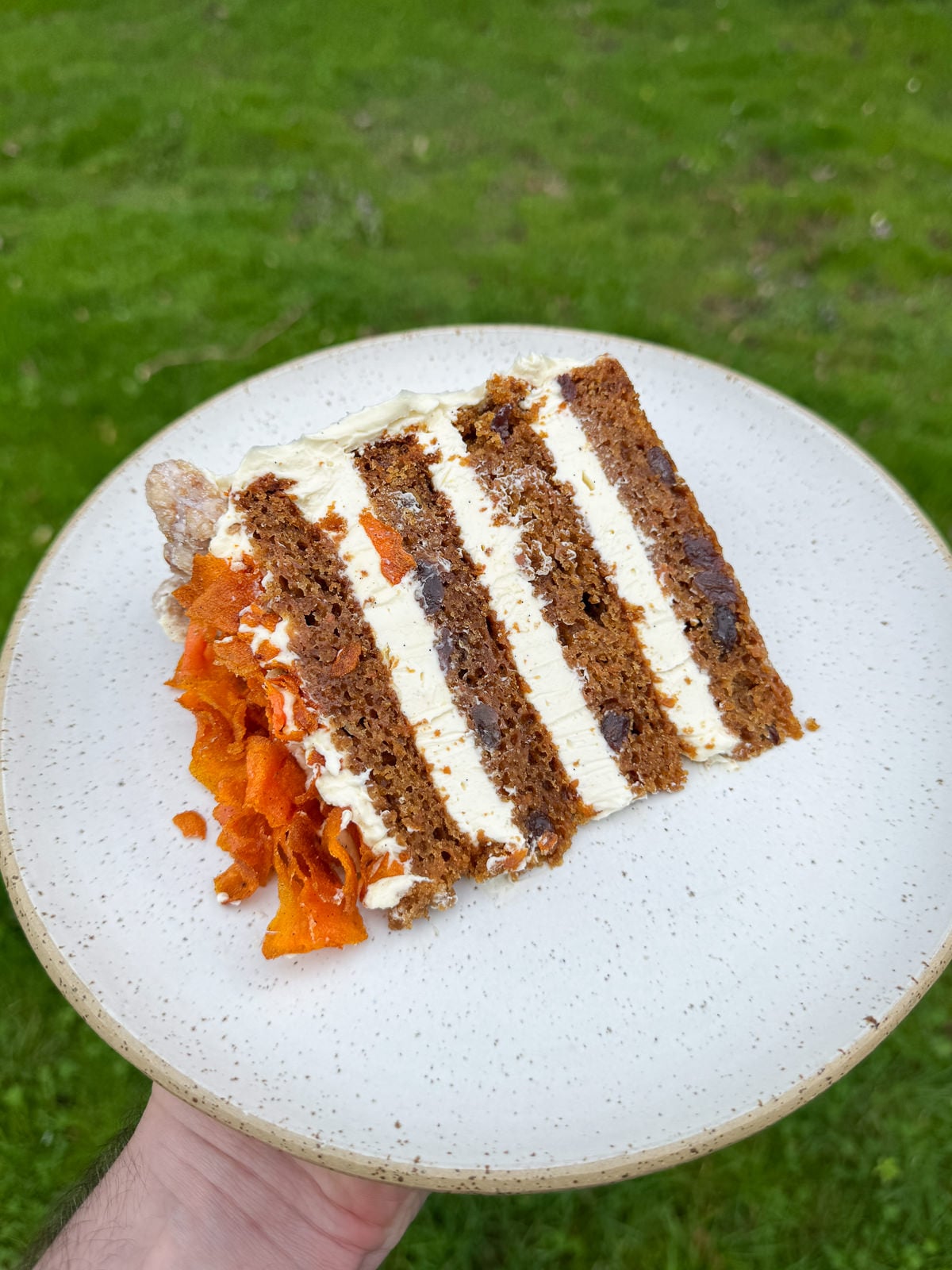Like most layers cakes, carrot cake is best served at room temperature. However as carrot cake is coated in cream cheese frosting, it needs to be stored in the fridge. So when you go to serve your cake, I’d highly recommend letting it sit out of the fridge for 30 minutes before serving. If you’re not serving the whole cake, cut slices off, let them sit out but put the rest of the cake back in the fridge.