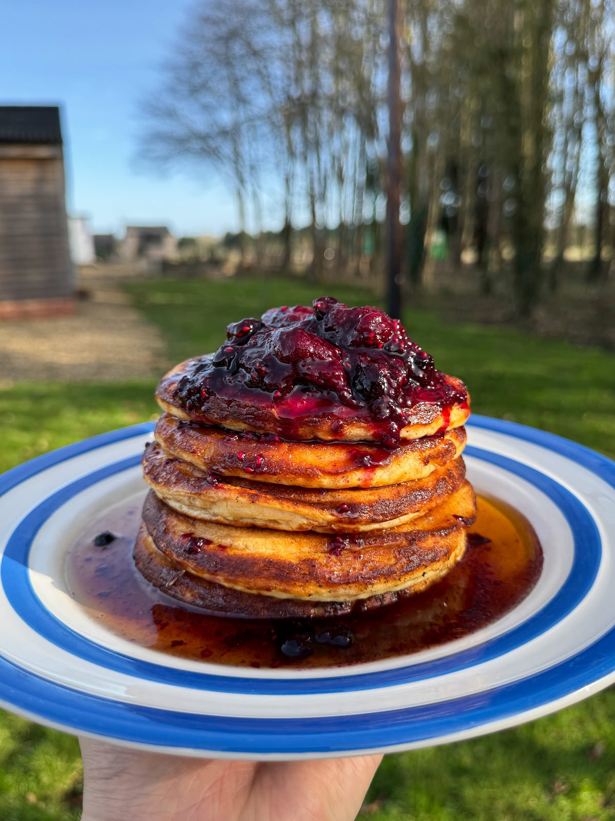 So this batch of American style pancakes is made with cottage cheese. This might sound a bit odd but adding cottage cheese to pancake batter gives them a subtle tangy flavour & an extra soft, custardy texture. There’s also a generous amount of maple syrup in the batter which gives these pancakes a buttery, caramel, butterscotch like flavour. They’re pretty damn tasty! I served mine in a stack with a generous spoonful of mixed berry compote & a plenty of extra maple syrup…