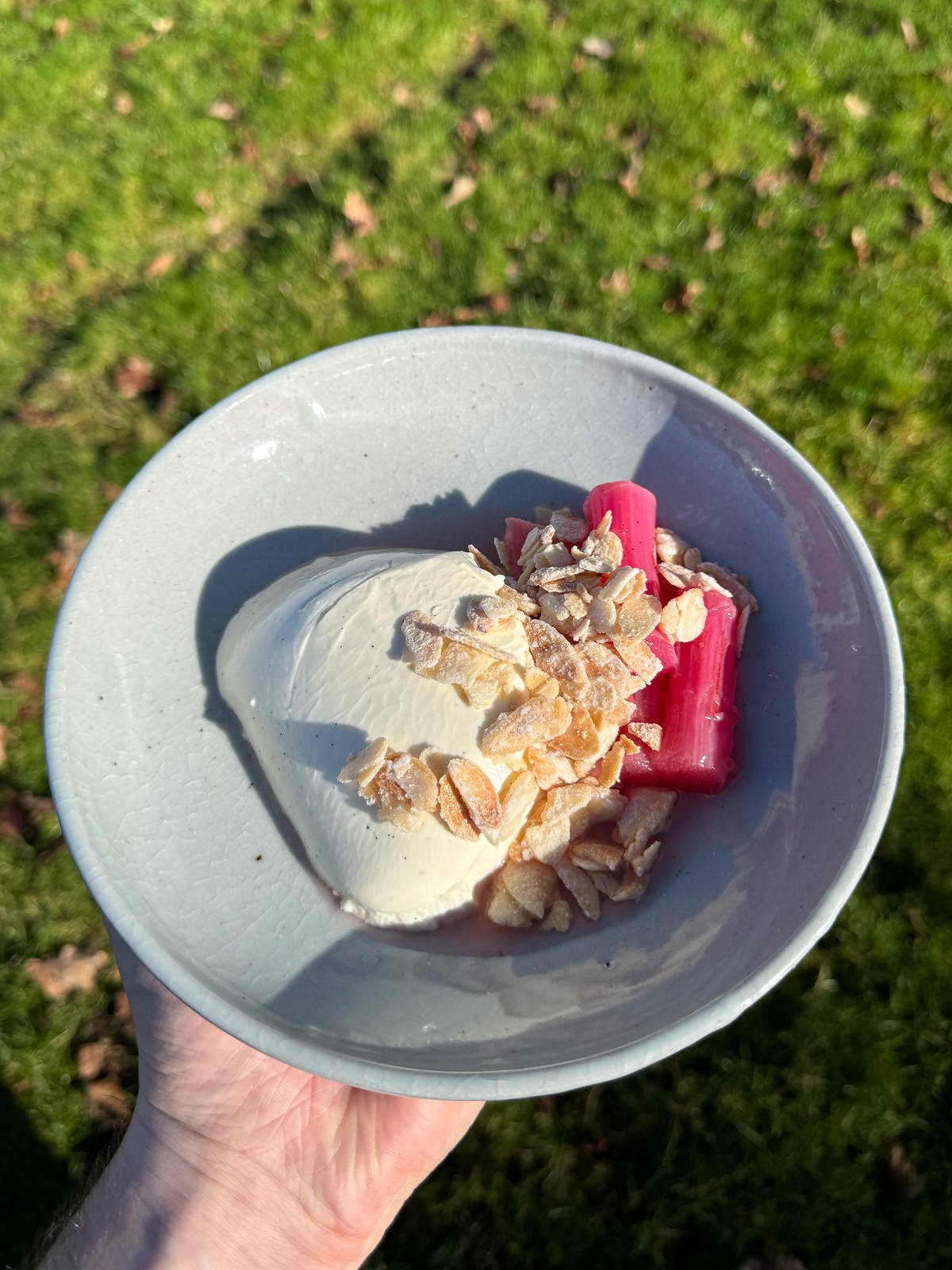 Vanilla panna cottas pair really well with garnishes that cut through the rich, creamy flavour & texture. I often serve my panna cottas with fruit that’s been either poached or roasted, to enhance its’ flavour and something crunchy like crystallised nuts or praline. For this particular batch of panna cotta, I went with some poached forced rhubarb & crystallised flaked almonds. However, they’re good with pretty much anything!